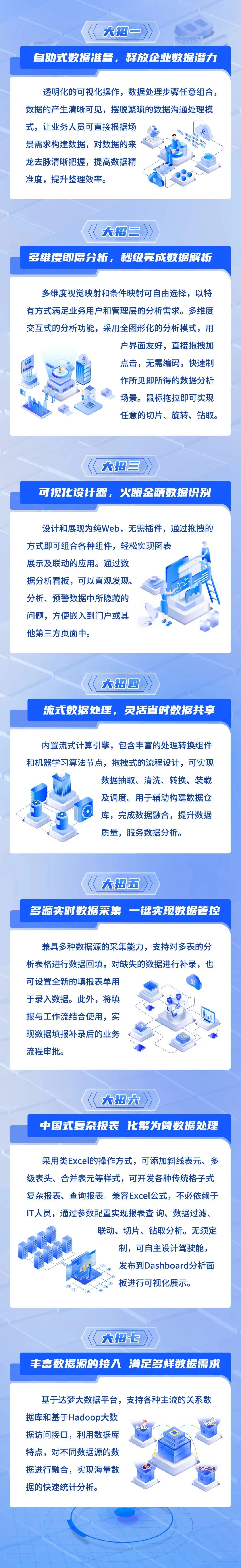 达梦启智 BI 系统采用全新设计理念,提供自助式数据准备、多维度即席分析、可视化设计器、流式数据处理、多源实时数据采集、中国式复杂报表、多数据源接入等 7 大功能,实时呈现业务数据整体态势,解决企业应用数据难题,让企业决策者更快更准地获取数据,辅助决策提升业务效能。