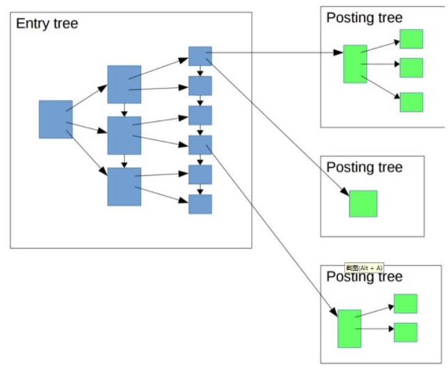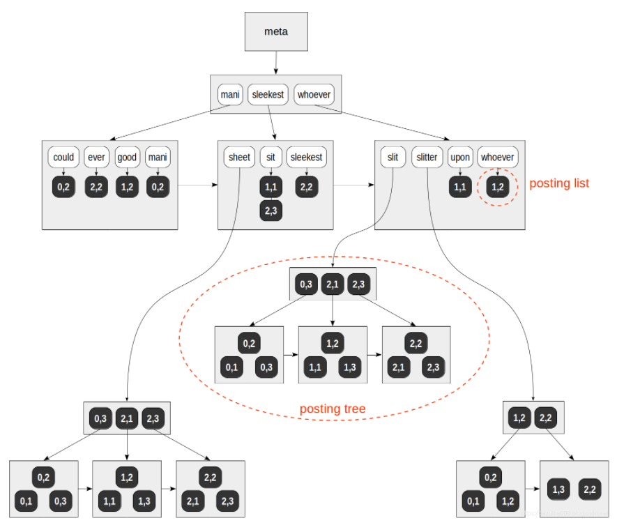 4. posting tree:在一个Entry出现的物理位置链表(heap ctid, 堆表行号)上构建的B树,所以posting tree的KEY是ctid,而entry tree的KEY是被索引的列的值