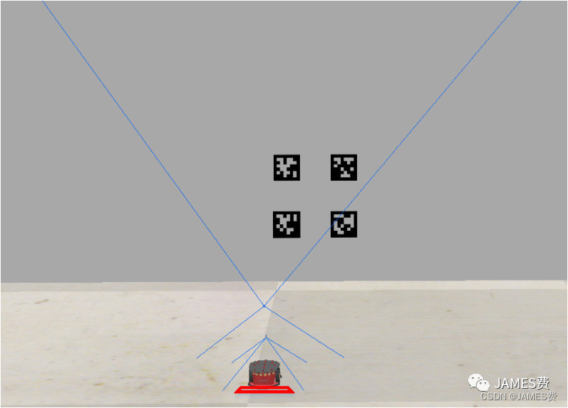 这里我们研究的场景不是室外或者开放环境的场景,我们对场景进行适当的简化,减少其它因素的影响,设置的场景是这样的,我们在墙上贴上三个二维码,充当人工的特征点,然后假设地面是水平的,相机固定在小车的正上方,朝向小车正前向位置。这样一来,可以知道,小车的运动,前后左右移动和转向,摄像头也跟着运动,且运动的自由度只有3个,即: