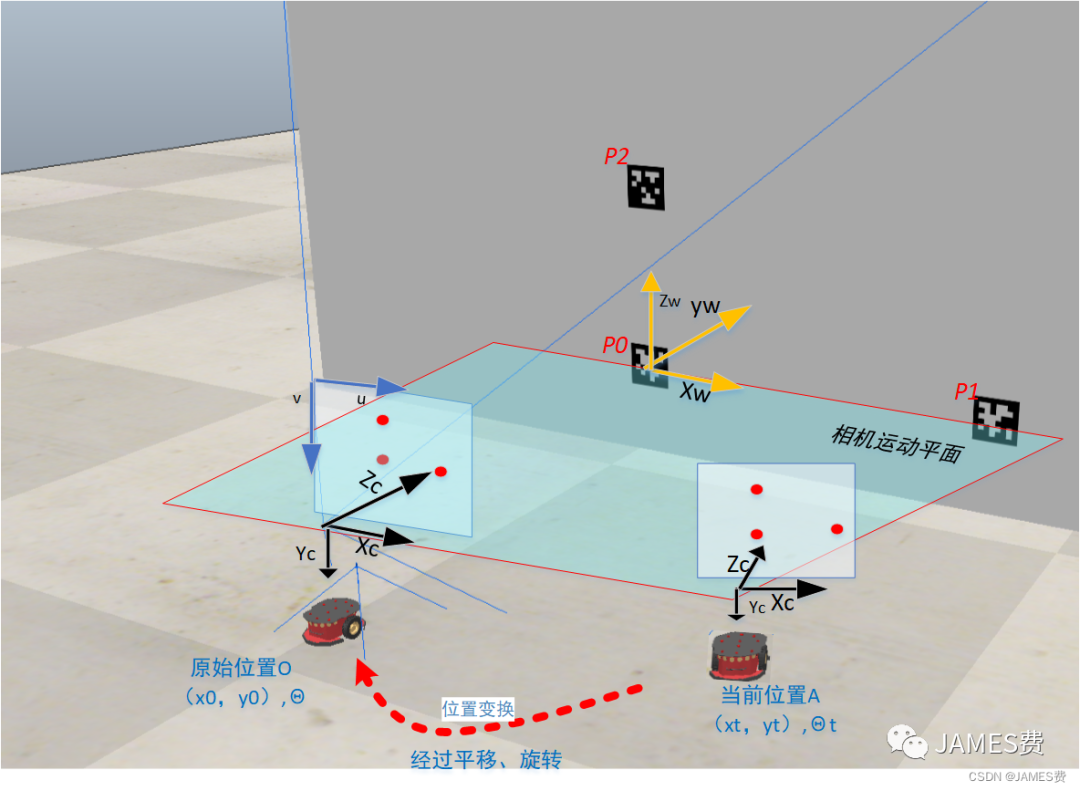 如图,相机在“相机运动平面”内运动(固定高度的平面内位置改变,只有xw,yw的变化),在运动平面内,随着小车的转向,相机沿着自身YC轴旋转,其它轴没有旋转运动。