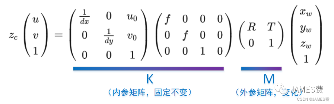 由相机的成像原理(主要是指小孔成像、相似原理),和三维坐标变换原理(主要是指三维坐标系的沿着x、y、z轴的移动和旋转),我们知道将一个在现实世界中的实物点(xw,yw,zw)投影到相机的照片图像上的一个点(u、v),需要经过一系列的坐标变换得到(由于这方面网上资料众多,这里不再赘述):