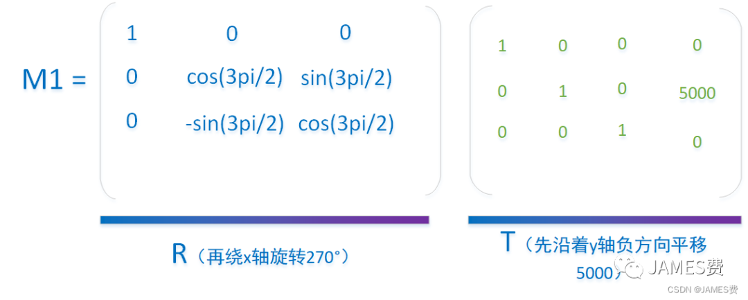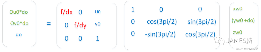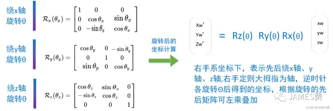 R: 从世界坐标系到相机坐标系的旋转变换矩阵,是分别绕三个轴旋转矩阵的乘积,绕三个轴旋转的矩阵分别为: