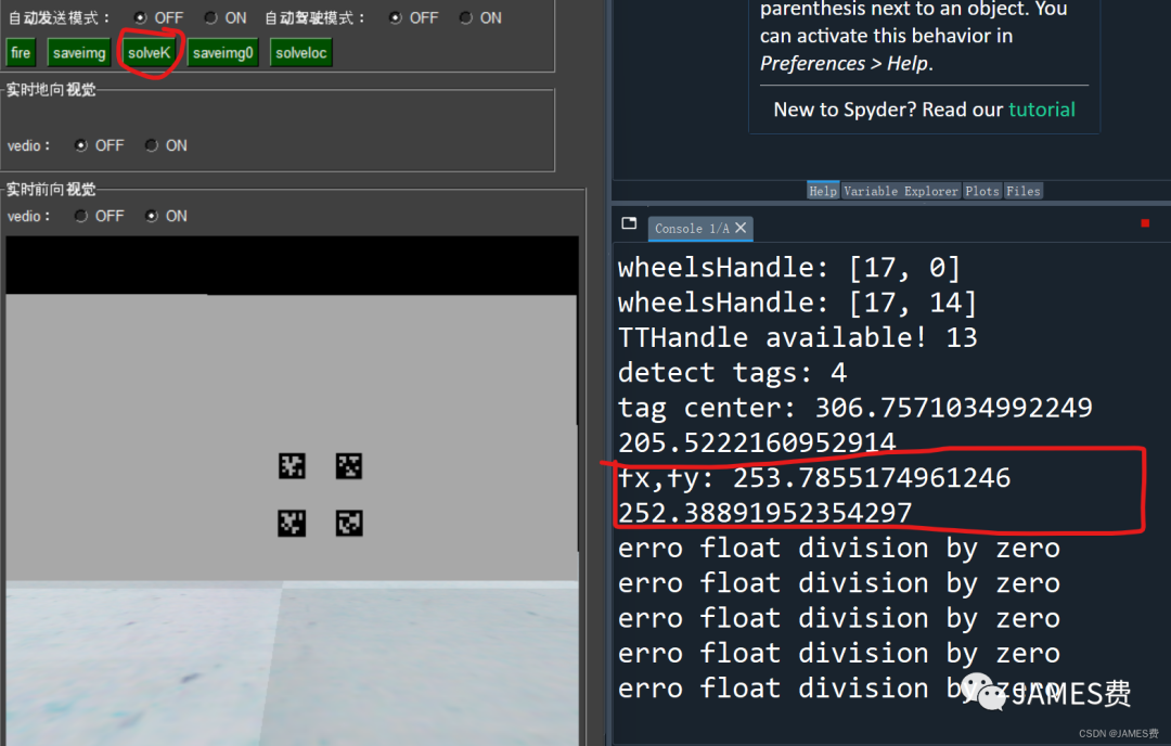 可以看到,由于识别的二维码位置有误差,计算出来的fx、fy会有误差,实际,在仿真环境,摄像头为理想模型无畸变,其参数为fx=256,fy=256。