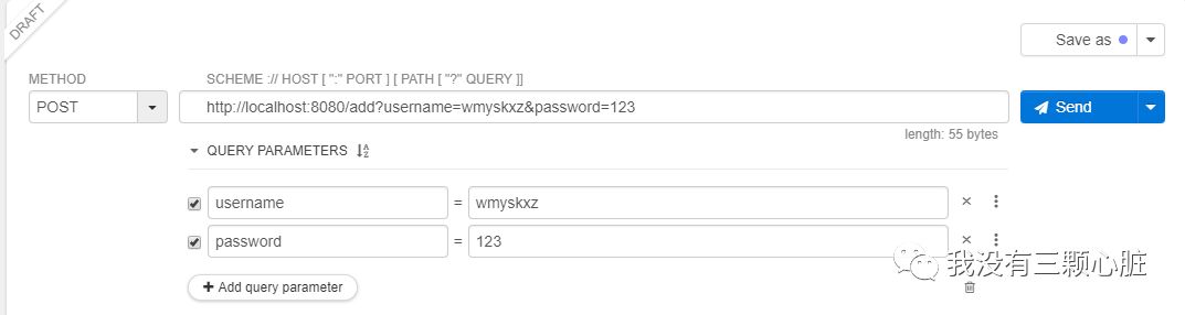 然后我们使用http://localhost:8080/add?username=wmyskxz&password=123