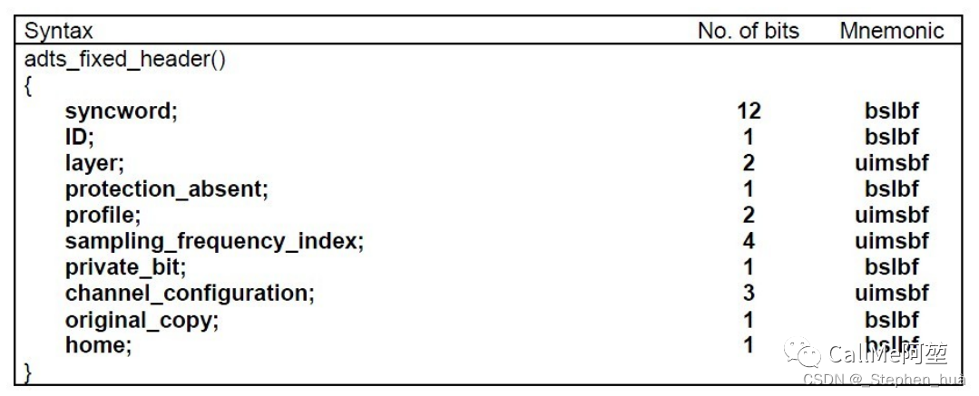 syncword,同步头总是0xFFF代表着ADTS帧的开始: ID,MPEG标识符,0标识MPEG-4,1标识MPEG-2; Layer,通常都是'00'; protection_absent,表示是否误码校验; profile,表示使用哪个级别的AAC; sampling_frequency_index,表示使用的采样率下标; channel_configuration,表示声道数