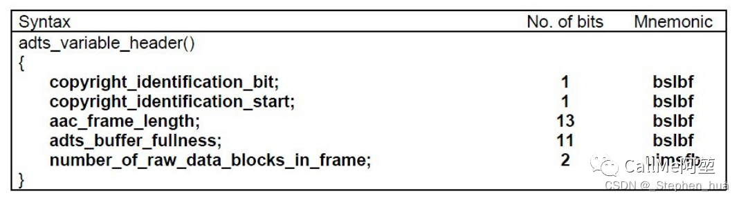 aac_frame_length,一个ADTS帧的长度(包括ADTS头和AAC原始流),通过是否存在误码校验来判断长度是7还是9个字节: adts_buffer_fullness,值为0x7FF则表示可变码率的码流; number_of_raw_data_blocks_in_frame,表示ADTS帧中有 number_of_raw_data_blocks_in_frame + 1个AAC原始帧。