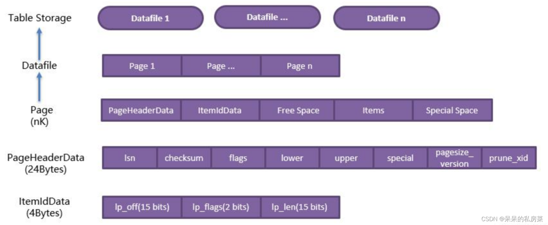 数据页由页头(PageHeaderData)、数据指针数组(ItemIdData)、可使用的空闲空间(Free space)、实际数据(Items)和特殊空间(Special Space)组成。