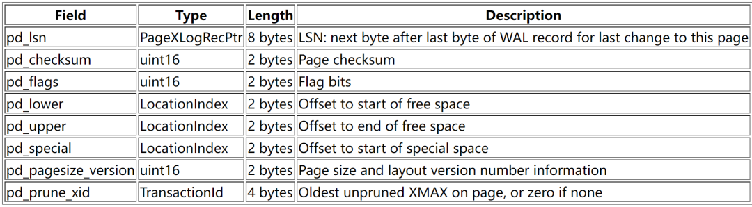 less src/include/storage/bufpage.htypedef struct PageHeaderData{/* XXX LSN is member of *any* block, not only page-organized ones */PageXLogRecPtr pd_lsn; /* LSN: next byte after last byte of xlog* record for last change to this page */uint16 pd_checksum; /* checksum */uint16 pd_flags; /* flag bits, see below */LocationIndex pd_lower; /* offset to start of free space */LocationIndex pd_upper; /* offset to end of free space */LocationIndex pd_special; /* offset to start of special space */uint16 pd_pagesize_version;TransactionId pd_prune_xid; /* oldest prunable XID, or zero if none */ItemIdData pd_linp[FLEXIBLE_ARRAY_MEMBER]; /* line pointer array */} PageHeaderData;