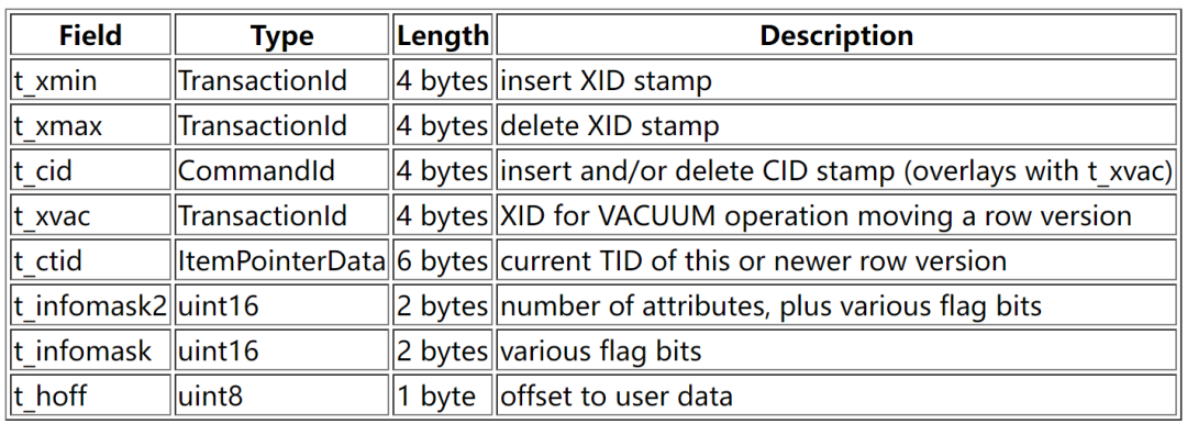 Field Type Length Offset Descriptiont_xmin TransactionId 4 bytes 0 insert XID stampt_xmax TransactionId 4 bytes 4 delete XID stampt_cid CommandId 4 bytes 8 insert and/or delete CID stamp (overlays with t_xvac)t_xvac TransactionId 4 bytes 8 XID for VACUUM operation moving a row versiont_ctid ItemPointerData 6 bytes 12 current TID of this or newer row versiont_infomask2 uint16 2 bytes 18 number of attributes, plus various flag bitst_infomask uint16 2 bytes 20 various flag bitst_hoff uint8 1 byte 22 offset to user data//注意:t_cid和t_xvac为联合体,共用存储空间