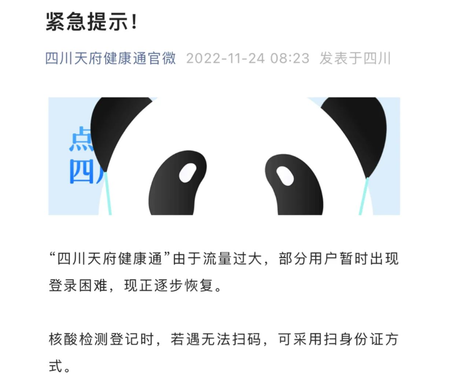 2022年11月24日,四川健康码崩了登上热搜榜,引起网友广泛关注。当日早间,四川天府健康通官微发布紧急提示称,“四川天府健康通”由于流量过大,部分用户暂时出现登录困难,现正逐步恢复。核酸检测登记时,若遇无法扫码,可采用扫身份证方式。