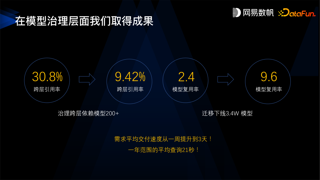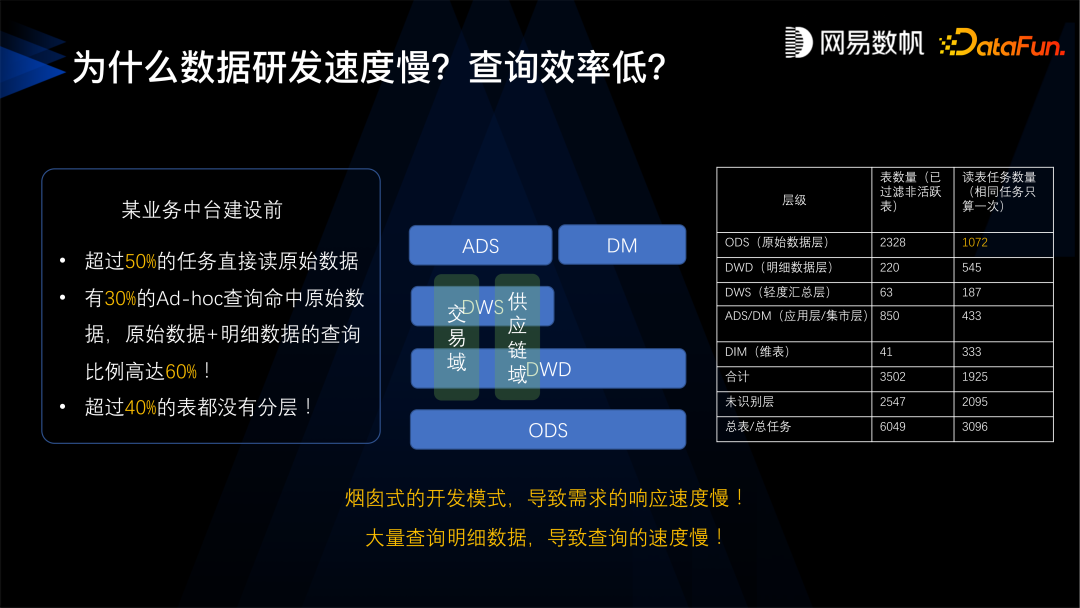 第一个问题是指标口径不一致,很多指标同名不同义、同义又不同名,不同部门之间的沟通存在很大困难。 第二个问题是缺乏数据建模规范,当时我们的数据团队非常辛苦,但还是不能满足业务上的需求,交付的速度还是非常慢,平均需要一周的时间, 并且查询的效率又特别低,一个月范围内的查询要将近一分钟, 一年内的查询要 300 多秒,找数据也特别困难,业务产生了几万张表,不知道哪里有数据,不知道怎么去找、怎么去用。 第三个问题是数据重复建设,有超过一半的数据是冗余的,数据量超线性增长。