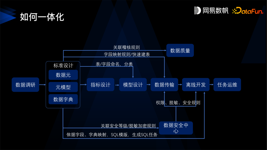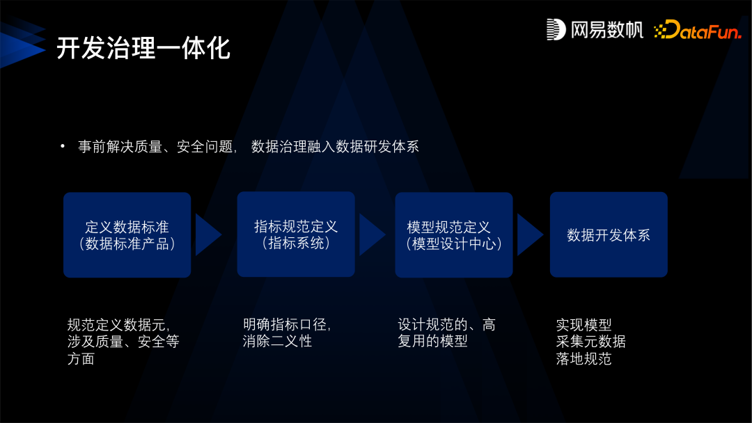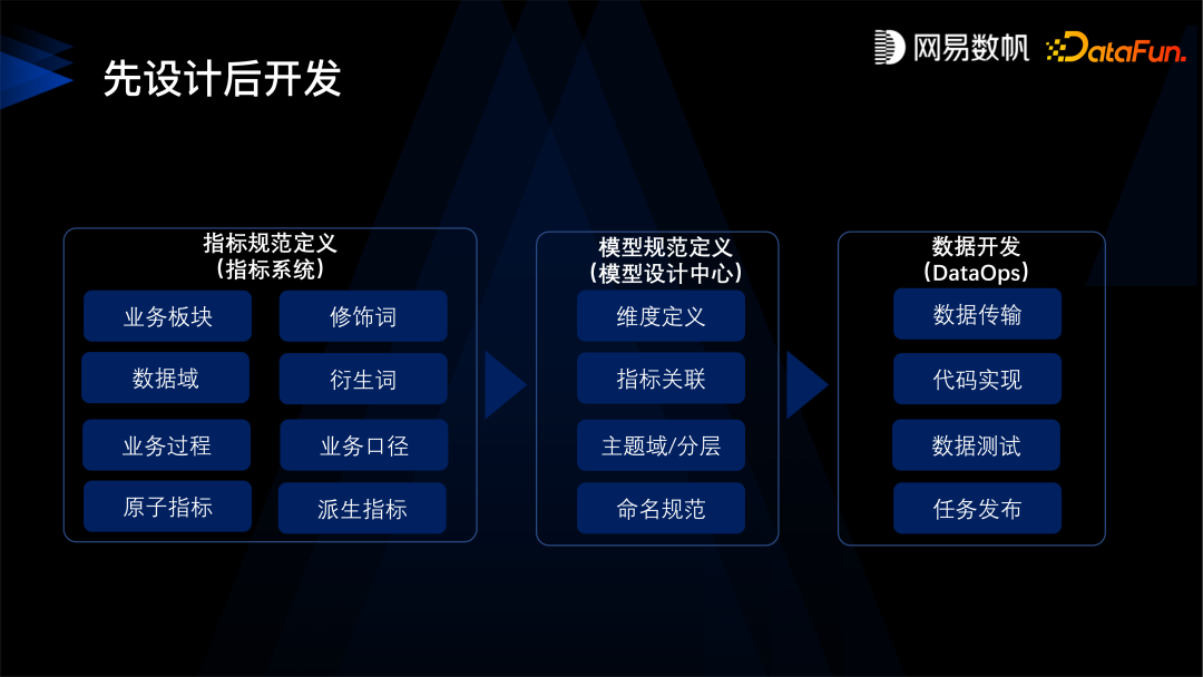 第一是要先定义数据标准,数据标准的核心是数据元,比如身份证就是一个数据元类型, 数据元就会规定它是一个字符串的类型,它的取值范围是什么样的,长度是多少,校验质量、校验规则是什么样的,还有设定身份证的隐私条件,比如是保密的,所有的质量安全规则都会绑定在身份证这个数据元上。 有了这样的数据元之后,第二步,是定义指标口径,明确指标的业务含义。 然后有了标准和指标规范之后,才是建设模型。指标规定了模型业务方面的需求,而标准规定了模型上的质量、安全规则,规定了类型和命名。 定义好模型之后,再进入到数据研发环节。