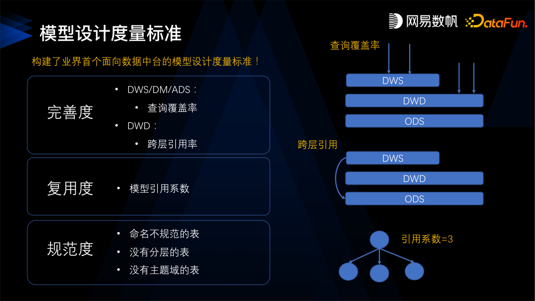 第一是完善度,可以分为两类,首先是查询的覆盖度,就是 ADS 层的表能满足多少比例的查询,这个比例越高说明建设得越完善,越能满足客户的需求;另外就是跨层的引用率,DWS 层直接引用 ODS 层,就叫跨层引用,跨层引用率越低越好,我们希望一层层往上叠加,不要产生跨层引用的情况。 第二是复用度,一个模型被下游模型引用的次数越多越好。 第三是规范度,是否存在不规范的表,没有分层的表,没有主题域的表等等。