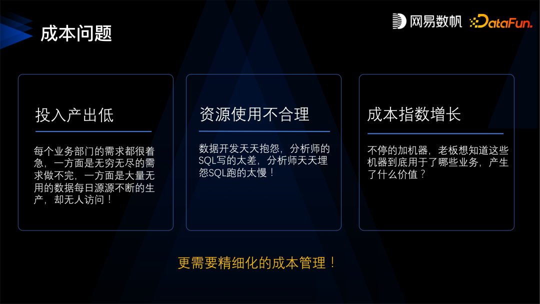 投入产出低:每个业务部门都有很着急的需求,一方面是需求做不完,另一方面是做出来的很多数据没有人用,我们有时发现有超过一半的表都是 30 天内没有人访问过,不得不怀疑这样的需求是否正确; 资源使用不合理:数据开发天天抱怨数据分析师的 SQL 写得太烂太占资源,分析师天天埋怨 SQL 跑得太慢,每周都有因为资源使用不当导致造成的事故; 成本指数增长:不停地加机器,已经非线性增长,老板也要问,这些机器到底用在了哪些业务?产生了什么价值?哪些可以做哪些可以省略不做?