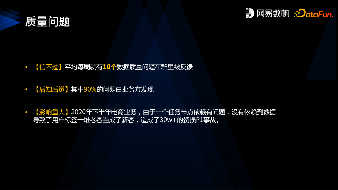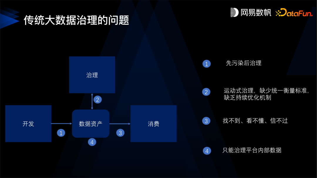 第一,先污染再治理,开发环节无法保证数据的出厂质量,出来的数据就不是很合格,过多依赖事后去治理数据,效率不高。 第二,运动式治理,缺少统一的数据治理的衡量标准,不确定效果,也缺乏持续优化的机制,这是存在于治理环节的问题。 第三,存在于数据消费的环节的问题是,消费者找不到、看不懂也信不过这些数据,导致数据很难被利用起来产生价值。 第四,只能治理大数据平台内的数据,无法管理其他系统的数据。通常互联网公司都把数据集中在大数据平台,但是我们在服务客户的过程中也发现了在很多行业不可能如此,因为他们有建设了不同系统来满足不同的场景需求, 所以我们的治理平台能不能治理大数据平台以外的数据也是一个问题。
