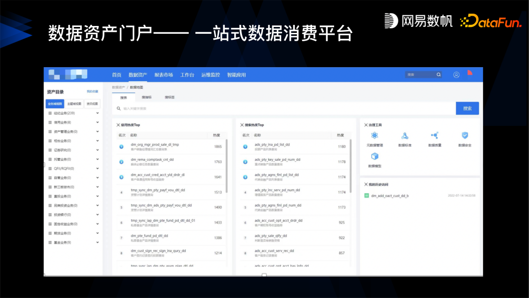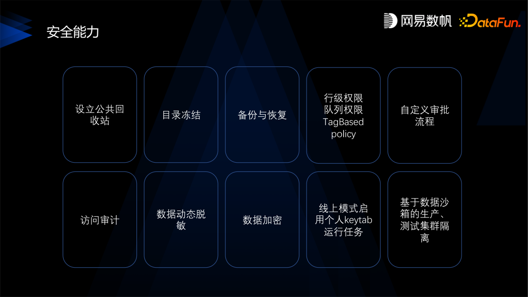 最下面是基础设施,这里有网易数帆自己的 NDH 发行版,也可以对接 CDH 或者 CDP,基础设施主要是提供存储计算能力,NDH 在回收站等方面也有加强,还做了一些存算分离、混合部署的工作。 在数据基础设施之上是数据研发,覆盖了从数据设计、开发、一直到测试、上线、运维的整个过程,希望能做成一个符合 DataOps 的数据研发产品。 在数据中台部分,我们提供了指标系统、模型设计、数据地图等产品,目的是帮助业务去建设数据中台。 在数据产品层,我们提供了很多工具,比如 BI 工具、数据门户,我们的理念是要利用低代码和无代码的方式,帮助用户、客户去打造面向场景化的数据产品,从而真正达成“人人用数据”的理念,实现数据生产力在企业落地。