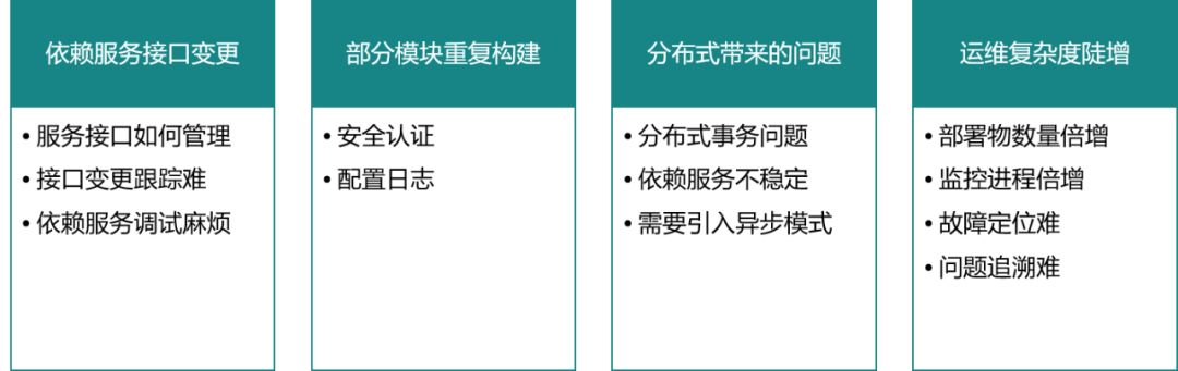 运维复杂度陡增,如:部署物数量多、监控进程多导致整体运维复杂度提升。