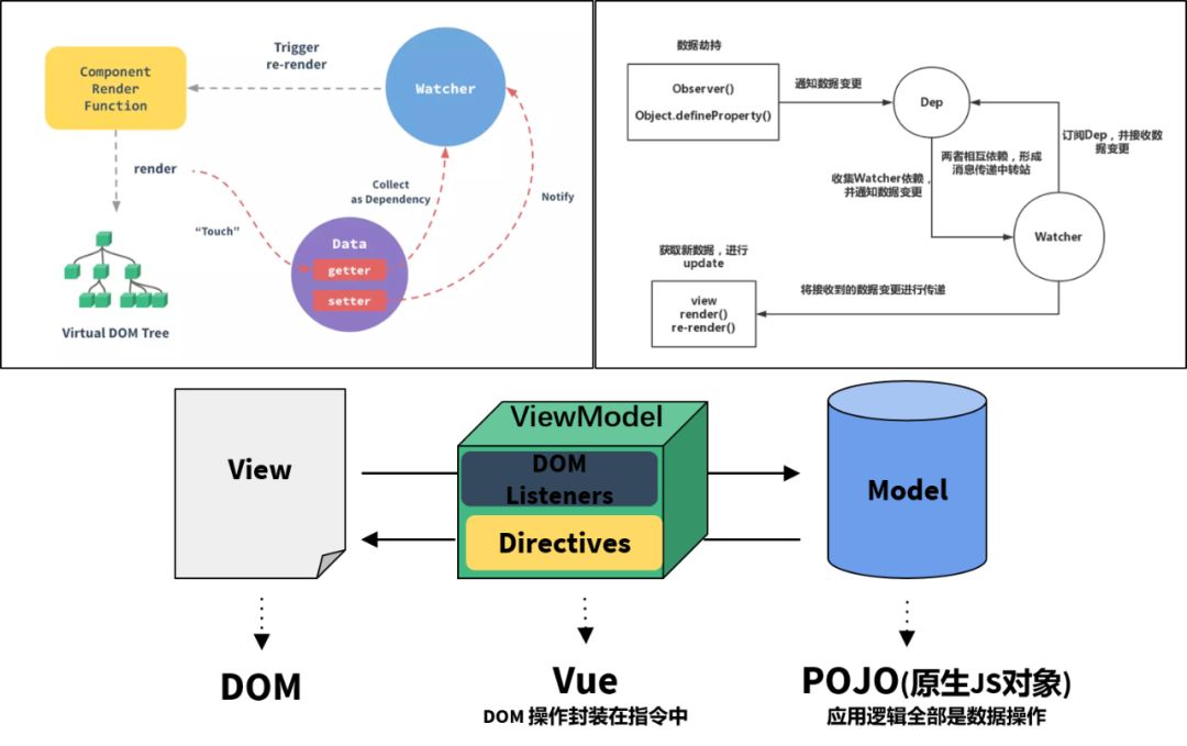 具体的来讲,Vue.js通过Directives指令去对DOM做封装,当数据发生变化,会通知指令去修改对应的DOM,数据驱动DOM的变化。vue.js还会对操作做一些监听(DOM Listener),当我们修改视图的时候,vue.js监听到这些变化,从而改变数据。这样就形成了数据的双向绑定。