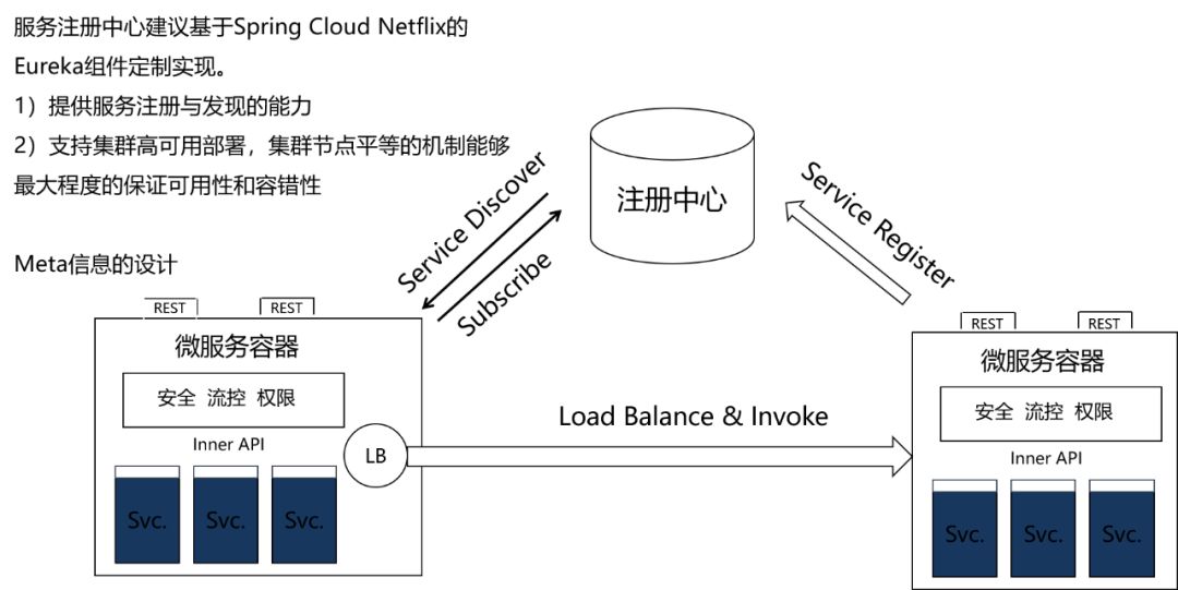 我们的服务注册发现能力是依赖SpringCloud Eureka组件实现的。服务在启动的时候,会将自己要发布的服务注册到服务注册中心,运行时,如果需要调用其他微服务的接口,那么就要先到注册中心获取服务提供者的地址,拿到地址后,通过微服务容器内部的简单负载均衡器进行路由。