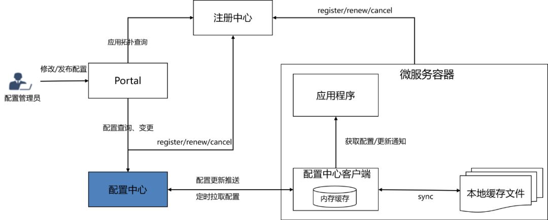 配置修改后通过推送或者定时拉取的方式更新并缓存到应用程序所在的微服务容器中供应用程序使用。