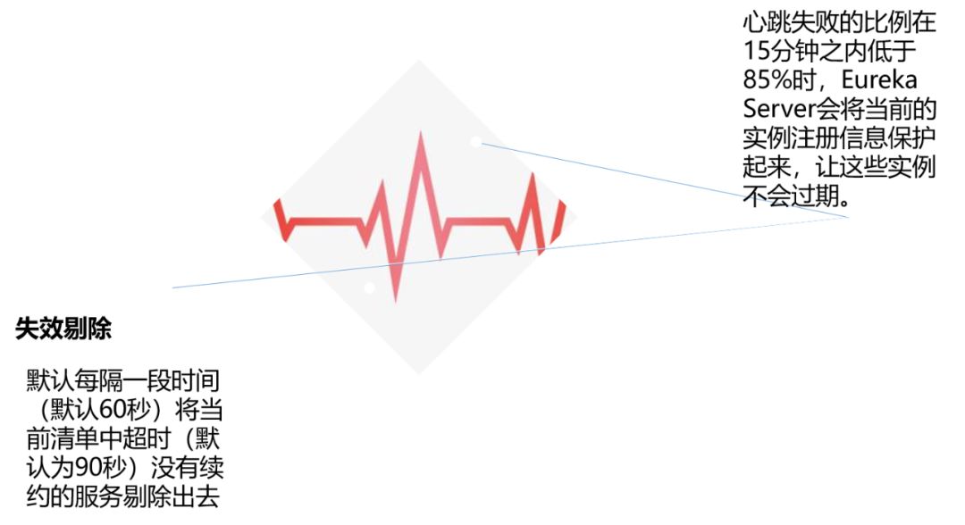 服务注册到Eureka Server之后,会维护一个心跳连接,告诉Eureka Server自己还活着。Eureka Server在运行期间,会统计心跳失败的比例在15分钟之内是否低于85%,如果出现低于的情况,Eureka Server会将当前的实例注册信息保护起来,让这些实例不会过期,尽可能保护这些注册信息。