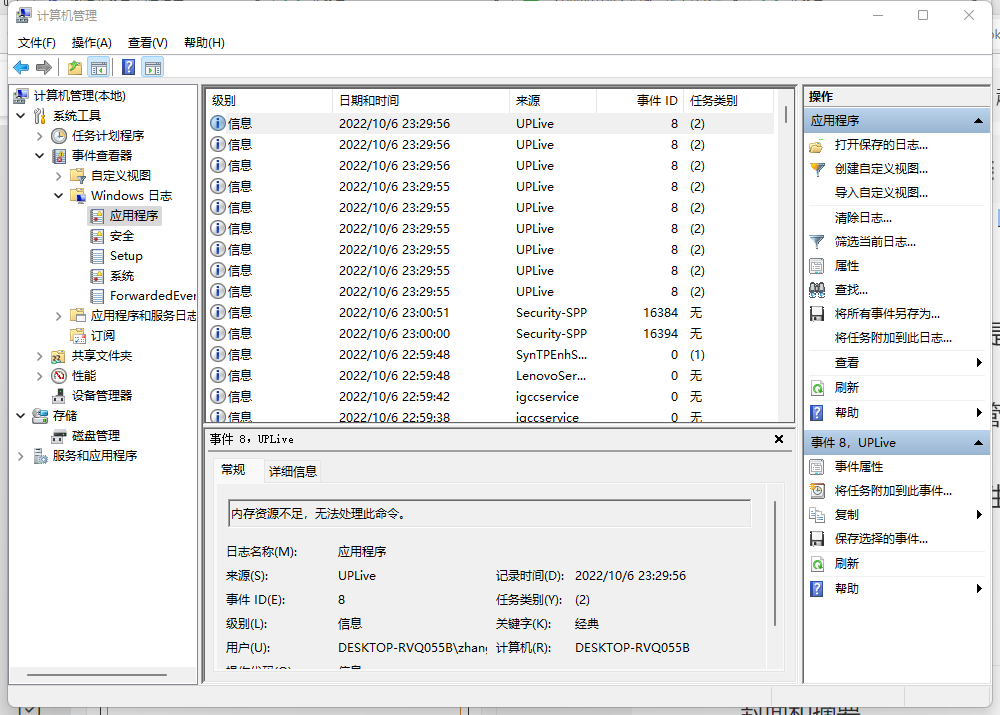 2、点击“事件查看器”、点击“Windows日志”、点击“应用程序”