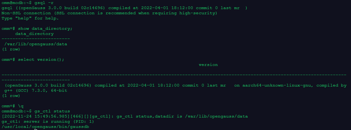 首先gsql -r连接进入数据库的shell,然后使用show data_directory查看文件目录和select version()查看数据库版本。最后用\q命令退出数据库结束实验。