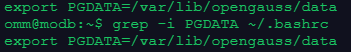 通过cat命令查看用户的环境变量文件~/.bashrc,可以看到文件末尾最后一行设置的数据文件目录,也可以用grep正则查询PGDATA关键词来只显示环境变量文件中包含PGDATA的内容,也即对应数据文件的那一行的内容。