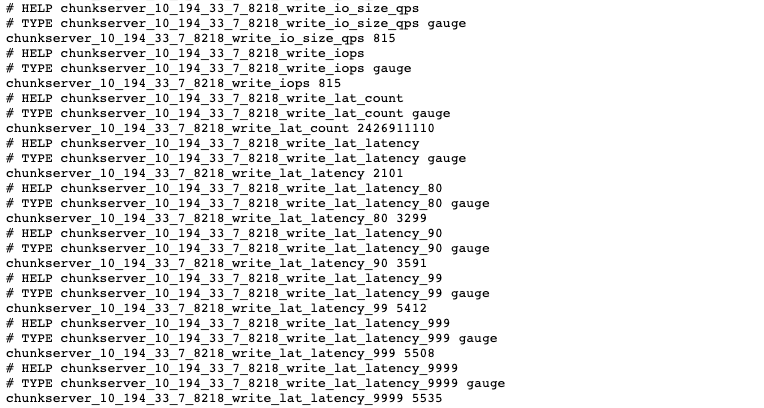 访问服务暴露的 HTTP Metric 接口获取各服务的实时指标信息(http://ip:port/metrics),其中 port 为服务启动的端口(例如:Curve块存储 mds 默认端口6666,Curve 块存储 Chunkserver 默认端口820*):