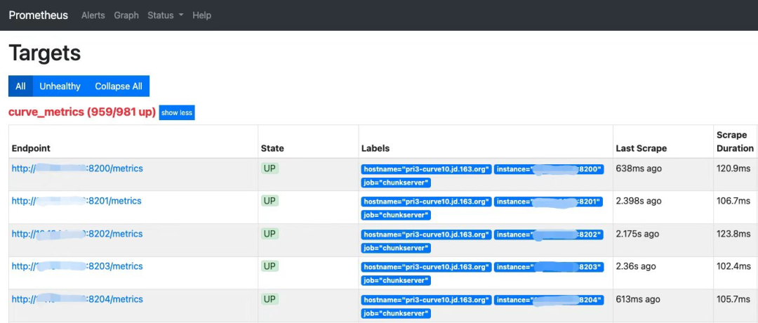 此时需要部署 Curve 监控系统,部署完成后 Prometheus 会采集系统 Metric 信息并进保存,采集的对象来自 target.json,采集对象的状态可通过访问 Prometheus 页面查看,形态见 Metrics on Prometheus。指标存储的路径和存储时间等配置在 docker-compose.yml 中(默认保存7天,256GB)。