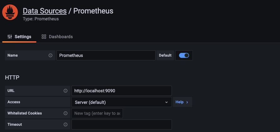 http://localhost:3000/datasources 设置数据源为 Prometheus,默认端口为9090。