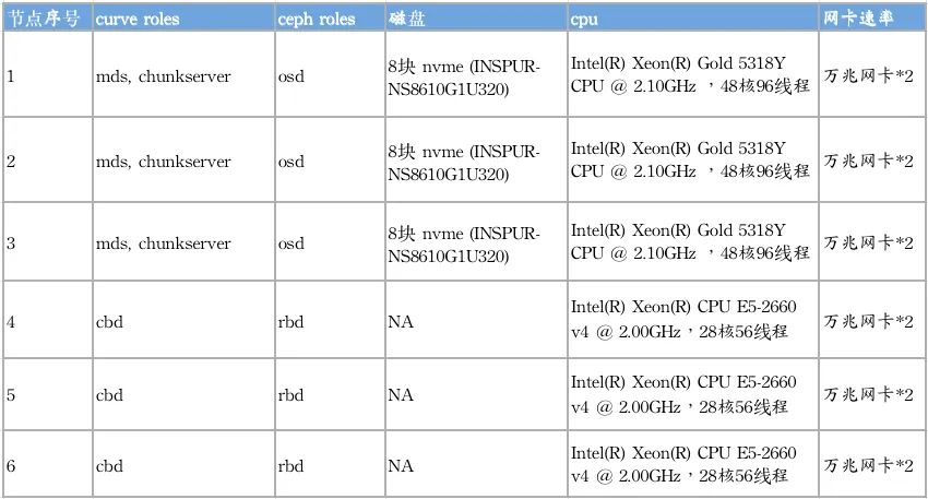 本次测试采用浪潮服务器 SA5112M6,磁盘采用三个节点每个节点八块浪潮 INSPUR-NS8610G1U320 nvme 进行测试,该 nvme ssd 具有极高的性能 (实测单盘性能 4k 随机写 IOPS 高达 240k,512k 顺序写极限带宽 3440MiB/s)。目前使用 Curve 集群测试下来,尚不能完全发挥该 nvme 盘的性能(CPU与网卡瓶颈),见下文测试结果。具体环境信息如下: