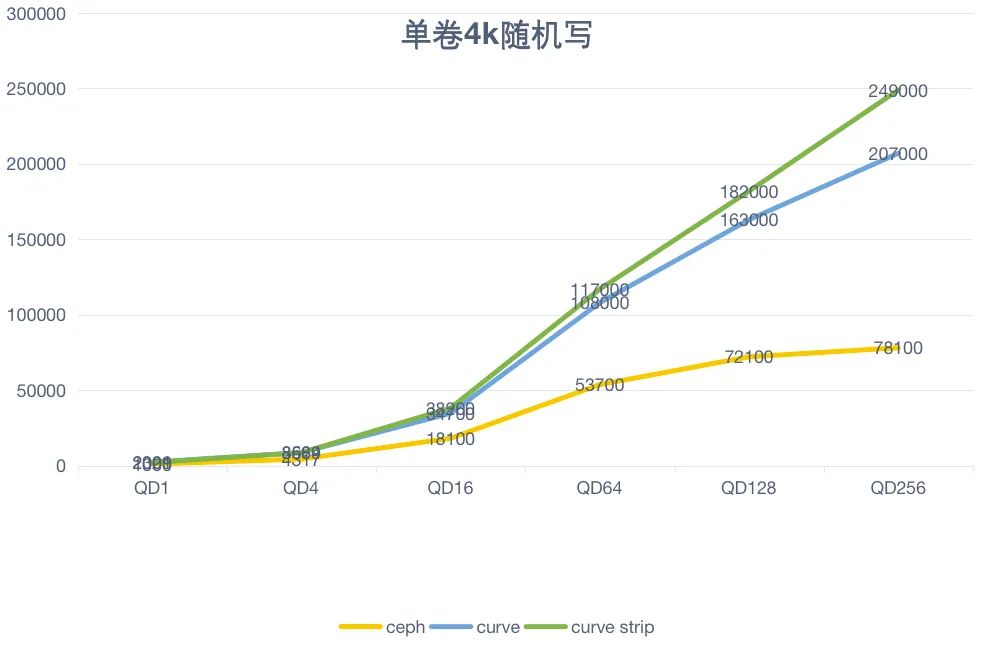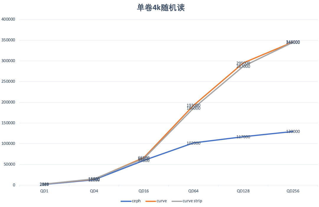 Curve相比于ceph在单卷小IO随机读的场景下,具有明显优于ceph的性能(QD256时,达到266%)