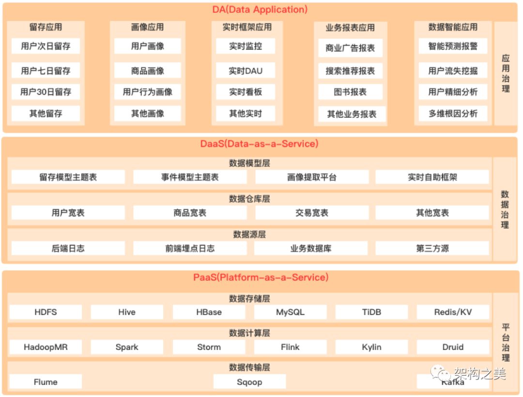 假如公司的数据架构采用了目前主流的Hadoop生态架构模式(如图5),其中大中台部分包括:PAAS层(数据传输、数据计算、数据存储)、DAAS层(数据源、数据仓库、数据集市 数据模型),小前台部分包括:DA(Data Application)(留存应用、画像应用、业务报表应用、数据智能应用)。