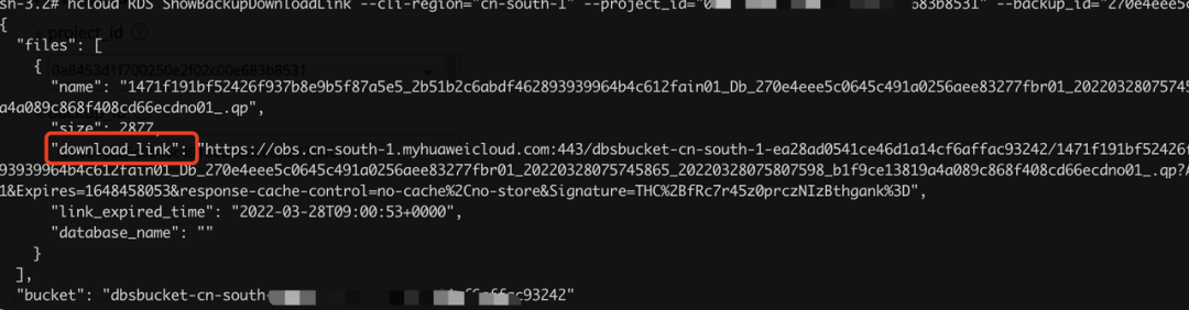 hcloud RDS ShowBackupDownloadLink --cli-region="cn-south-1" --project_id="0a8453d1f700250e2f02c00e683b8531" --backup_id="270e4eee5c0645c491a0256aee83277fbr01"