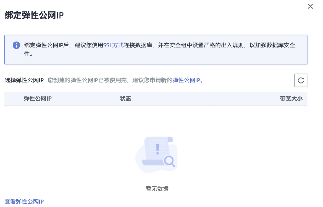 如果数据库创建在内网中,我们可以绑定公网IP来连接,需要注意的是这个公网IP必须是用户自己购买的。