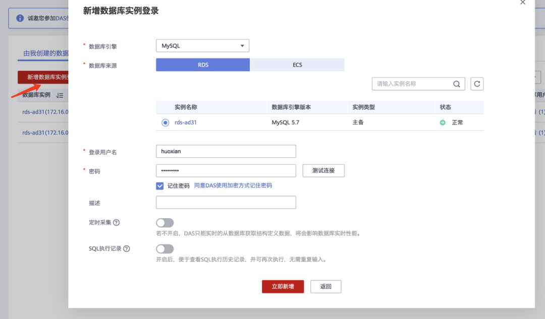 接着新增数据库实例登录,这里选择记住密码,我们自己账号登录时便不需要密码了。