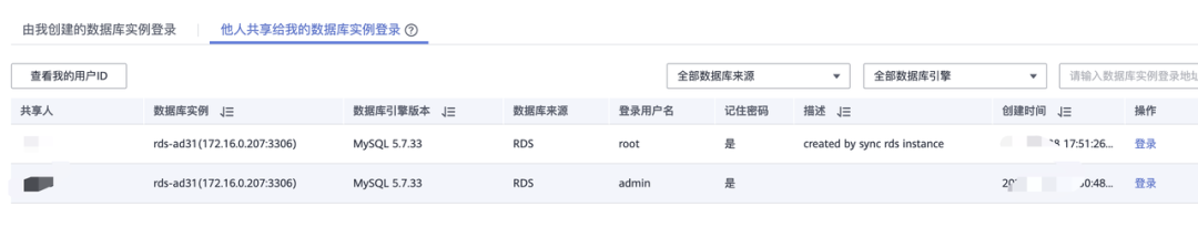 我们可以将对方的数据库实例分享给自己,然后在自己的控制台就可以登录。