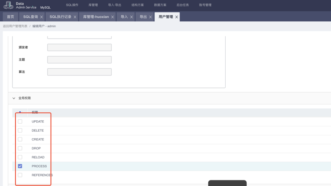 例如账号无法使用UPDATE,CREATE等权限,可以在用户管理-全局权限处设置。