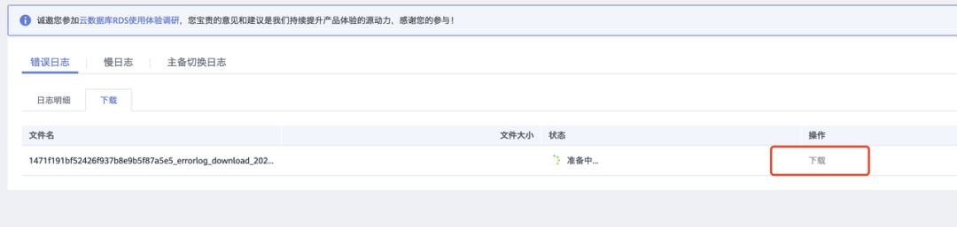 可下载错误日志,慢日志和主备切换日志来查找信息。