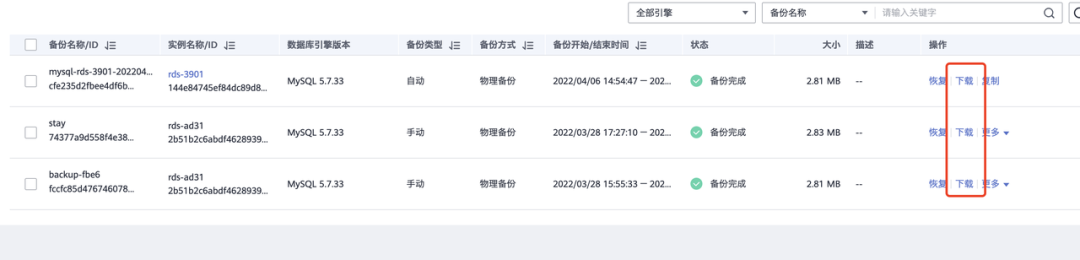 在备份管理处可以看到数据库的备份情况,可以恢复或者下载,查找数据。