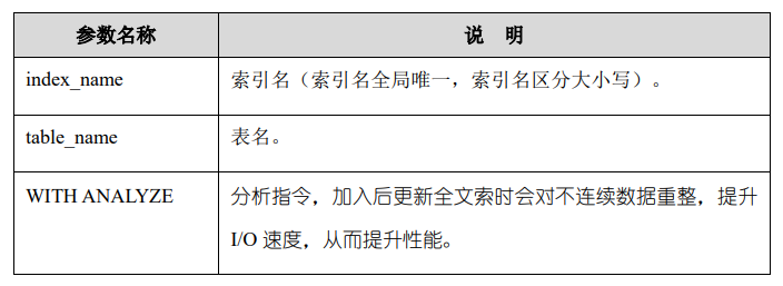 UPDATE INDEX index_name ON table_name [WITH ANALYZE];