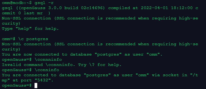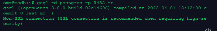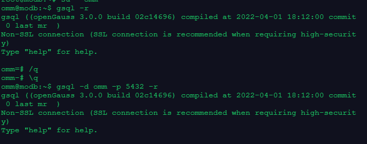 使用omm用户连接到本机omm数据库的5432端口,命令中的-r选项提供了对gsql命令的历史版本支持。