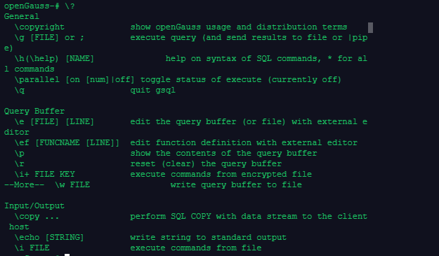 gsql是openGauss提供在命令行下运行的数据库连接工具,可以通过此工具连接服务器并对其进行操作和维护,除了具备操作数据库的基本功能,gsql还提供了若干高级特性,便于用户使用。