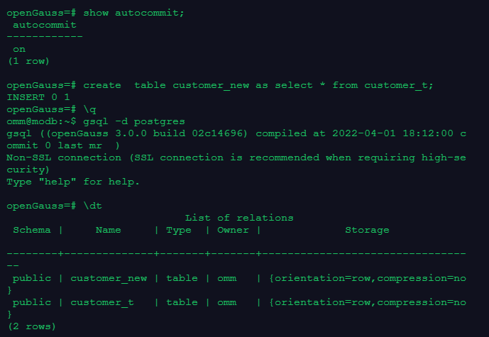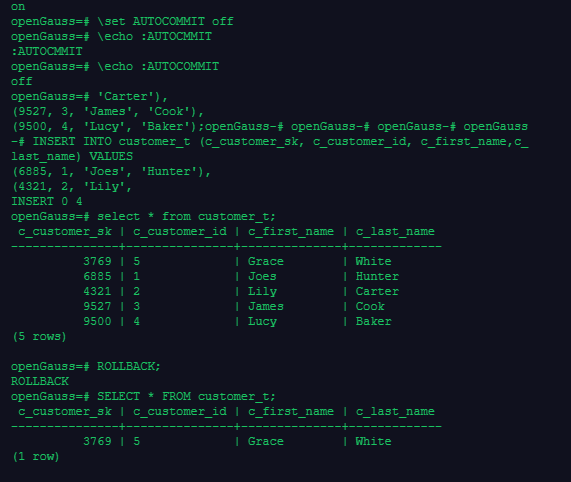 Opengauss默认执行完一条语句后,立即提交。可以关闭自动提交功能: