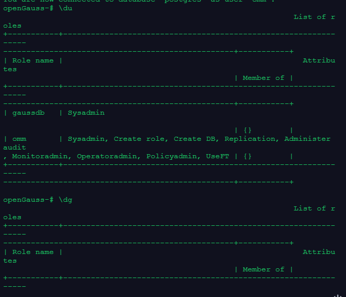 \du命令和\dg命令,元命令\dg命令与元命令\du命令的作用类似,都是显示openGauss数据库集簇中,目前有哪些用户和角色。