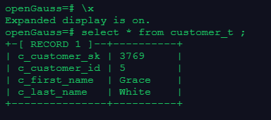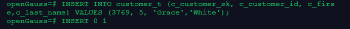 INSERT INTO customer\_t (c\_customer\_sk, c\_customer\_id, c\_first\_name,c\_last\_name) VALUES (3769, 5, 'Grace','White');
