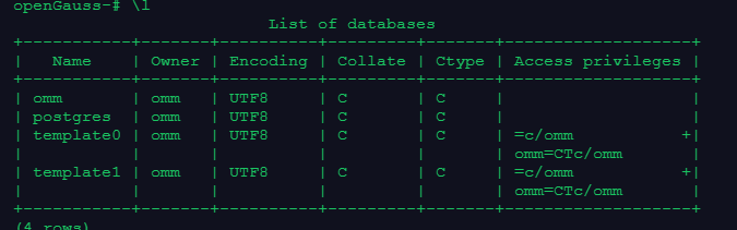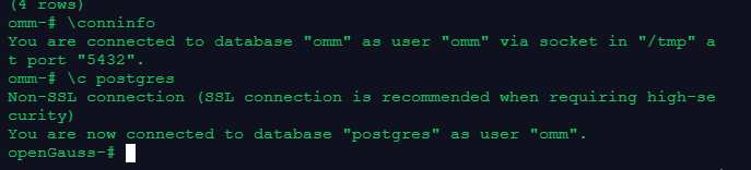 b、登录默认库omm后,使用\c命令连接到postgres库