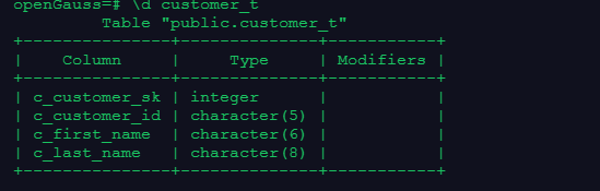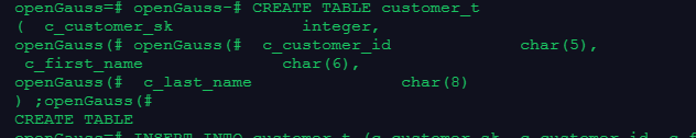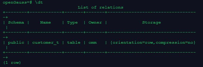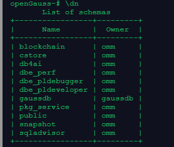 gsql是GaussDB提供在命令行下运行的数据库连接工具,基本功能是连接数据库;执行sql语句;执行元命令。在使用gsql时要注意先确认连接信息,以操作系统用户omm登录数据库主节点后连接数据库,一般默认生成名为postgres的数据库(在本次实训环境中默认omm)。我们在操作时候使用元命令更加便利,数据库元命令具有简短方便的特点,尤其是\du,\dg,\dn等。