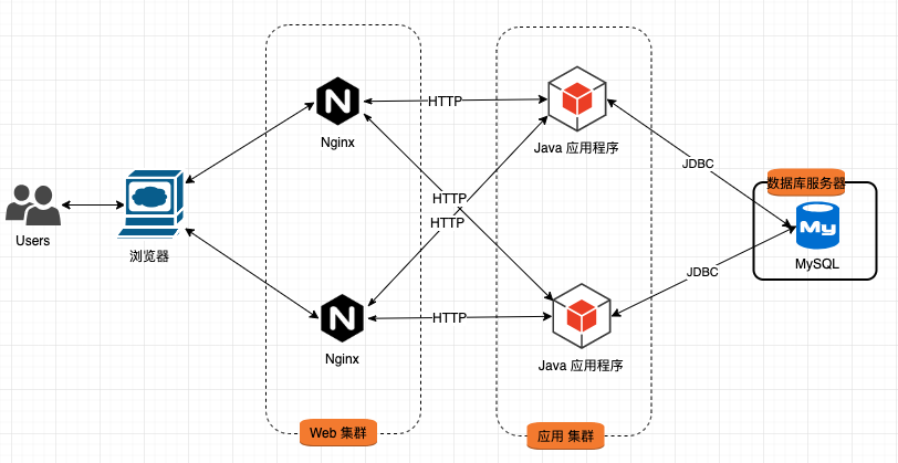 应用集群 与 数据库 间通过 JDBC 协议进行交互。